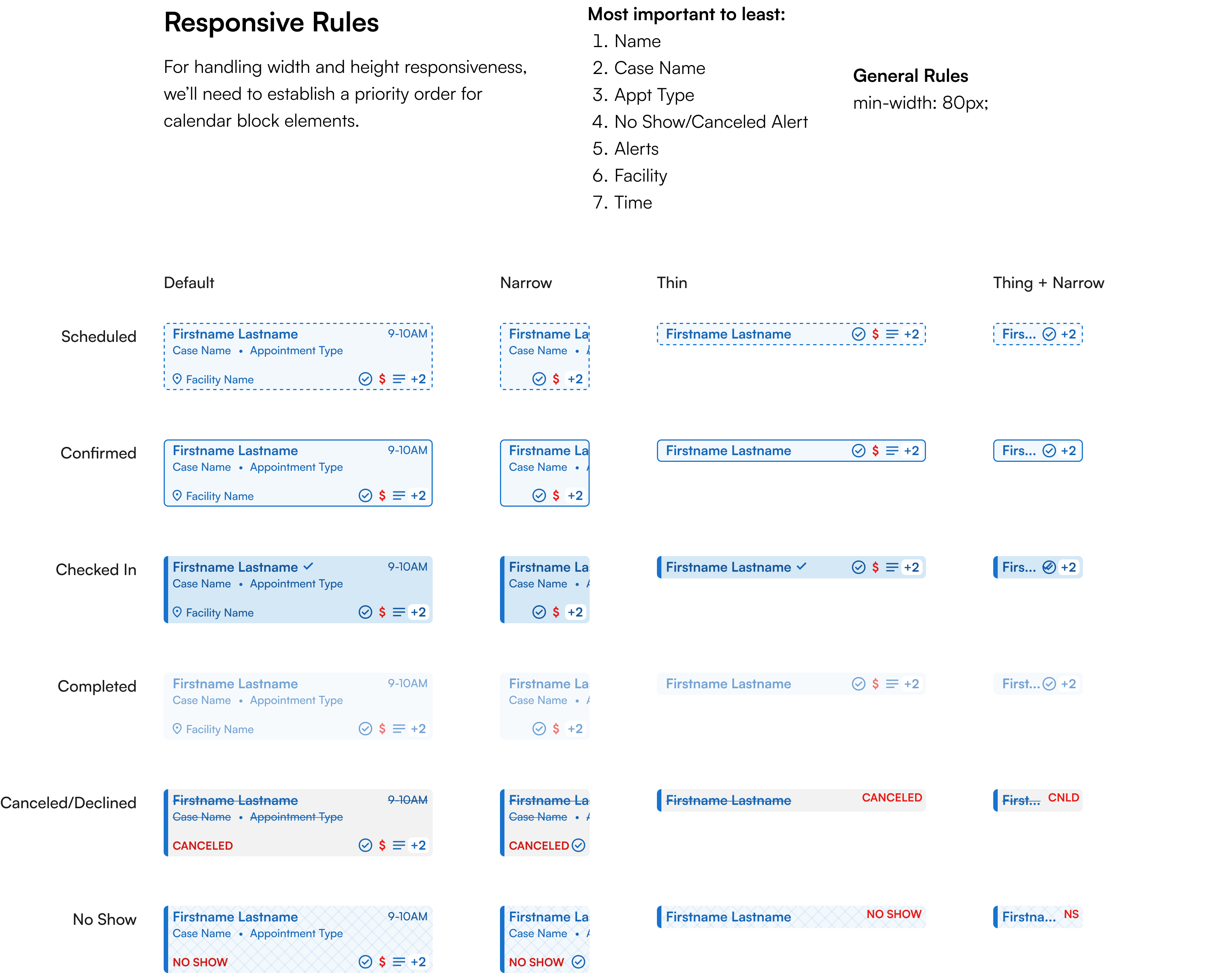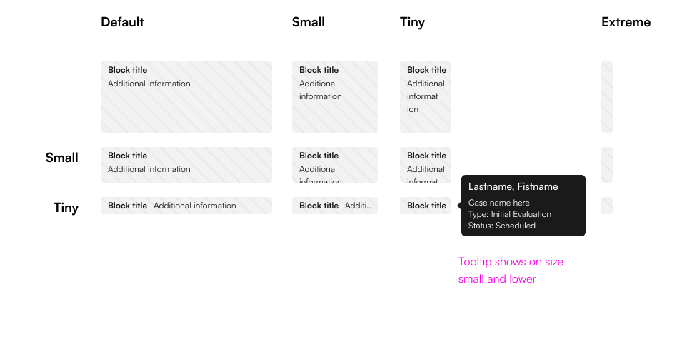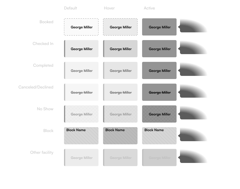 Initially, we’d placed the facility name on the block. We heard this was seen as repeated, low-value information causing noise, plus we soon decided to handle facilities differently on the calendar.