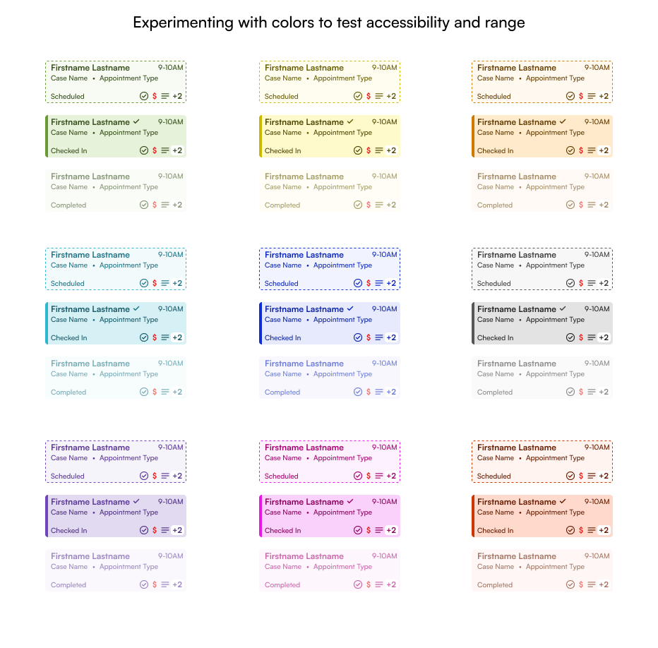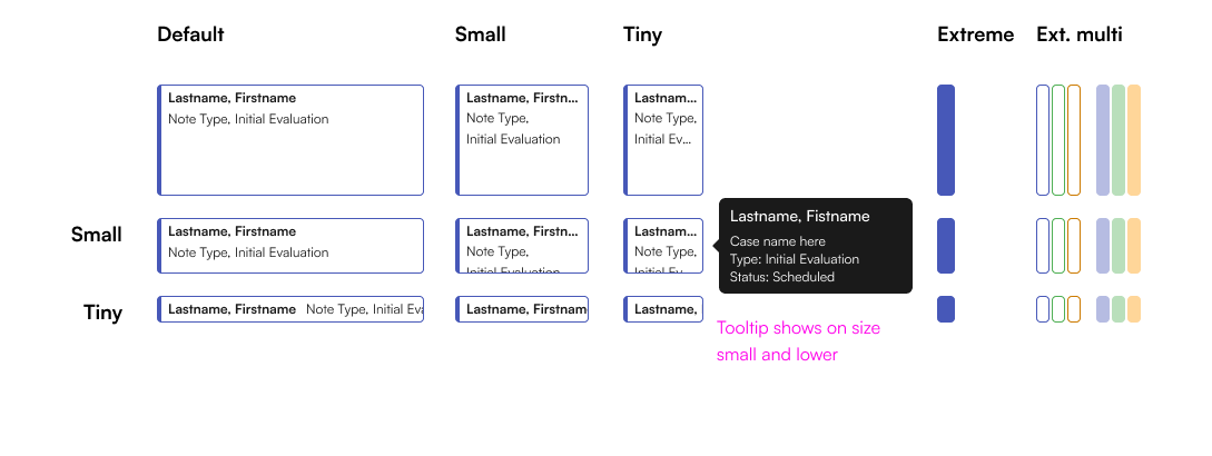 To solve this, I darkened all the block background colors an added the saturated color bar to all statuses. On smaller sizes, the bar got even thicker to ensure clarity.