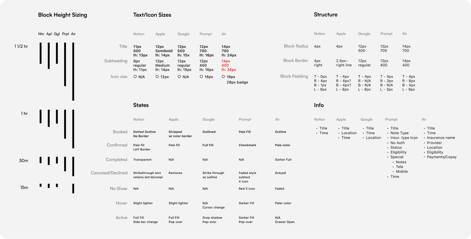 Picking apart everyday calendars (Google, Apple, Notion) would help me determine what make a solid baseline calendar. From there, studying other EMR calendars would help inform me on where we’re falling short and how we can get competitive.